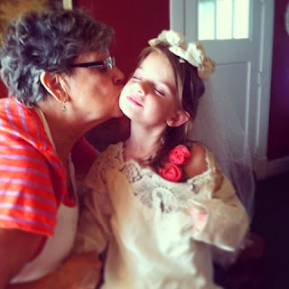 I had to borrow this beautiful photo of Olivia and her "mawmaw". Livvey is wearing her mawmaw's beauty and her bridal gown. They are sharing a moment of pretend.There are many lovely facets to this sweet photo.